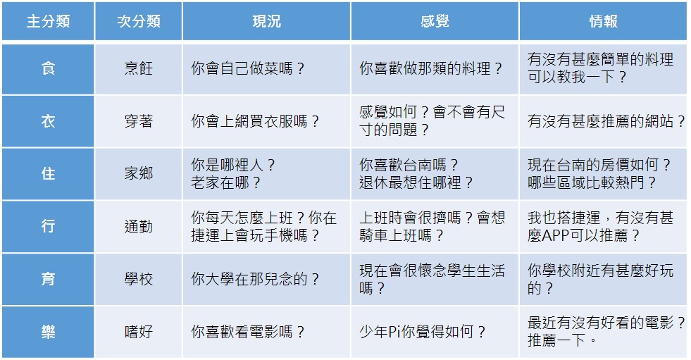 橫軸依據「現況 - 感覺 - 情報」這樣的順序一般來說會比較順,但也不是絕對,維持自然的對話最重要。至於縱軸的部分則不需要照著食衣住行育樂的順序進行(這樣很快會被發現你是照SOP),而且話題可以在不同的分類中跳躍,比方說聊到對方念的大學(育)時,可以順勢跳到周邊的美食(食),再跳到附近的房價(住)。總之,化有形於無形,天南地北,東拉西扯,是聊天的最高境界!