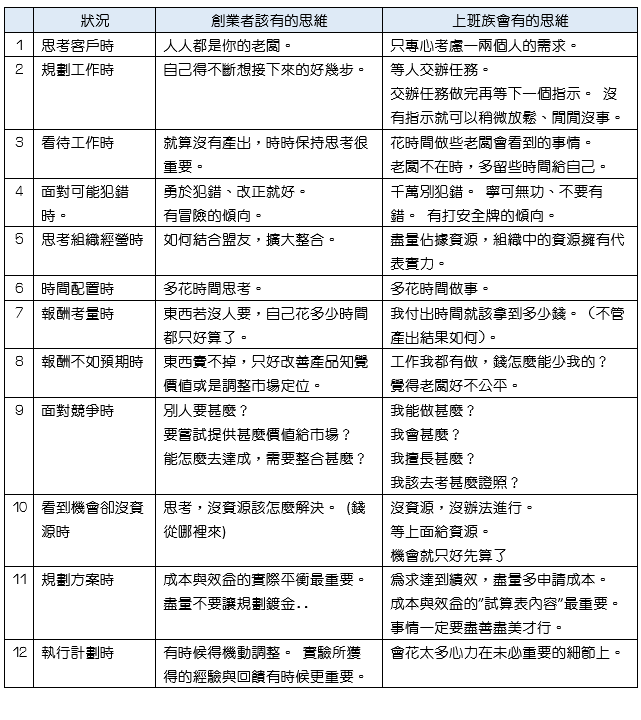 總而言之,我把一些上班族跟創業者在思考上常有明確差異的地方列出來。 大家可以參考參考,也可以看看自己的思維到底是偏左還是偏右。