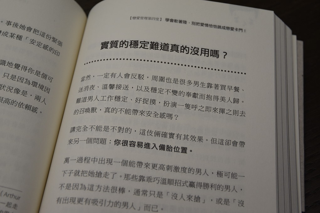 市面上很多寫給男生的戀愛書都只著重於把妹。 但大部分男生其實沒有想到處把妹,而是想找個女生好好發展一段長期關係。 可是把妹的書除了教你搭訕外,沒有太多其他如何與女性相處的知識。 但要讓關係持續,你得讓女生獲得安全感、提升涉入度、讓她願意為這關係放入心力。 這是這本書中最想教給各位的知識! |