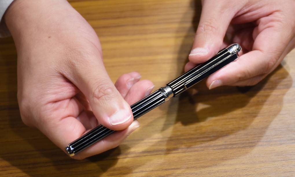 這支Silverline的個性很符合我對紳士的定義:約束與奔放合而為一。琺瑯黑的沈穩基調與銳利的純銀線條巧妙地結合在筆桿。拿在手上很有份量,為即將而來的書寫憑添了儀式感。而且特別的是,它的筆蓋是螺旋接合的,也就是說,當你準備寫字時你不是「拔開」筆蓋,而是要把它「旋開」。一開始我愣了一下,很少看到這樣的設計,後來一想就明白,這正是因約束而帶來的優雅。想想看,當你正要簽下重要合約時,徐緩地旋開筆蓋要比「啵」一聲拔開筆蓋(不小心手肘還會碰到鄰座)要沈穩瀟灑的多了。而且匠心獨具的是,當你書寫結束旋緊筆蓋時,你會發現筆身和筆蓋上的銀線會精準地重合成一線。如果你是跟我一樣有「對齊強迫症」的人,光是旋緊筆蓋這個動作就會為你帶來無限的舒暢!