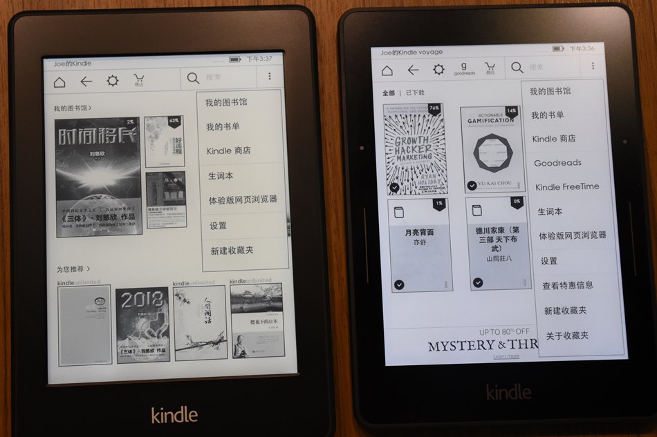 下圖是兩台選單的照片。看起來Voyage好像選單內容多一些,但其實是因為我Voyage連的是美帳,而美帳有些網路服務是陸帳沒有的,如Goodread、Kindle Freetime等,所以其實核心功能都一樣。