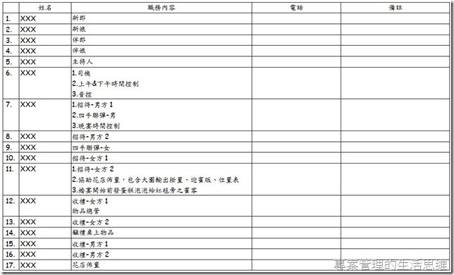 新郎為了讓大家有更好的默契,請大家吃了一頓午餐,辦了個專案啟動會議(Kick-off Meeting)。席中新郎為大家做了個簡報(對,又是簡報!),說明婚禮的流程,個人責任分派等。一群二三十歲的男生女生聚在餐廳,絕對是培養默契有餘,認真討論不足,果然演變成史上最歡樂之Project Kick-off Meeting。但新郎早已料到這點,拿出一疊工作說明書(Statement of Work. SOW),裡面包含了每個人的責任分派(Responsibility Assignment Matrix, RAM, 圖一)以及整個婚禮流程與時間表(Project Schedule, 圖二)。