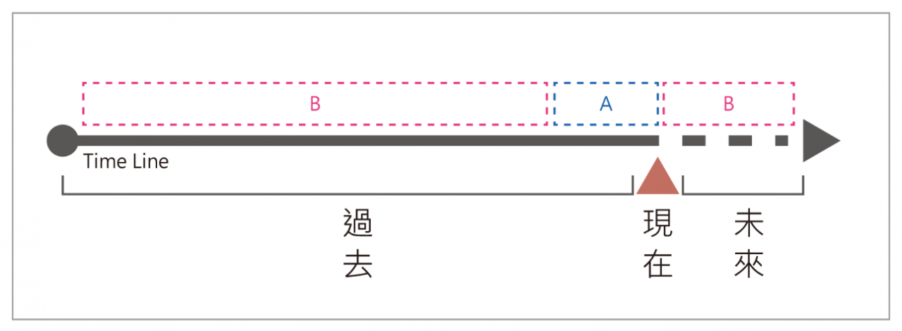 可惜的是,大部分人因為忙於生活,一直都沒有時間可以靜下來沉澱,導致對「知己」的自我探索範圍多半停留在近幾年(如下圖範圍A),你看,這樣一點點的範圍的了解,足以做出正確的決策嗎?當然不行!