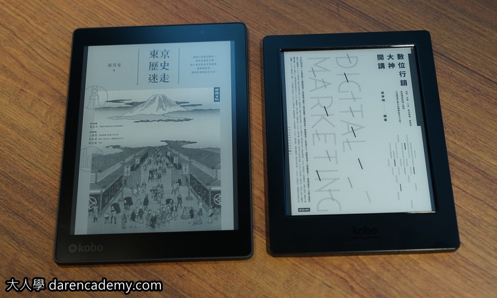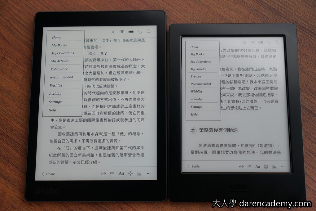 規格上的差異就是H2O是6.8吋的,Aura One是7.8吋的。此外前者是265ppi,後者則是300ppi。再來就是容量差異。H2O有兩代,我的是一代,所以只有4G的空間(但可插記憶卡),而Aura One則有32G的空間(但不可加記憶卡擴充)。重量則兩台差不多,都是230g左右。