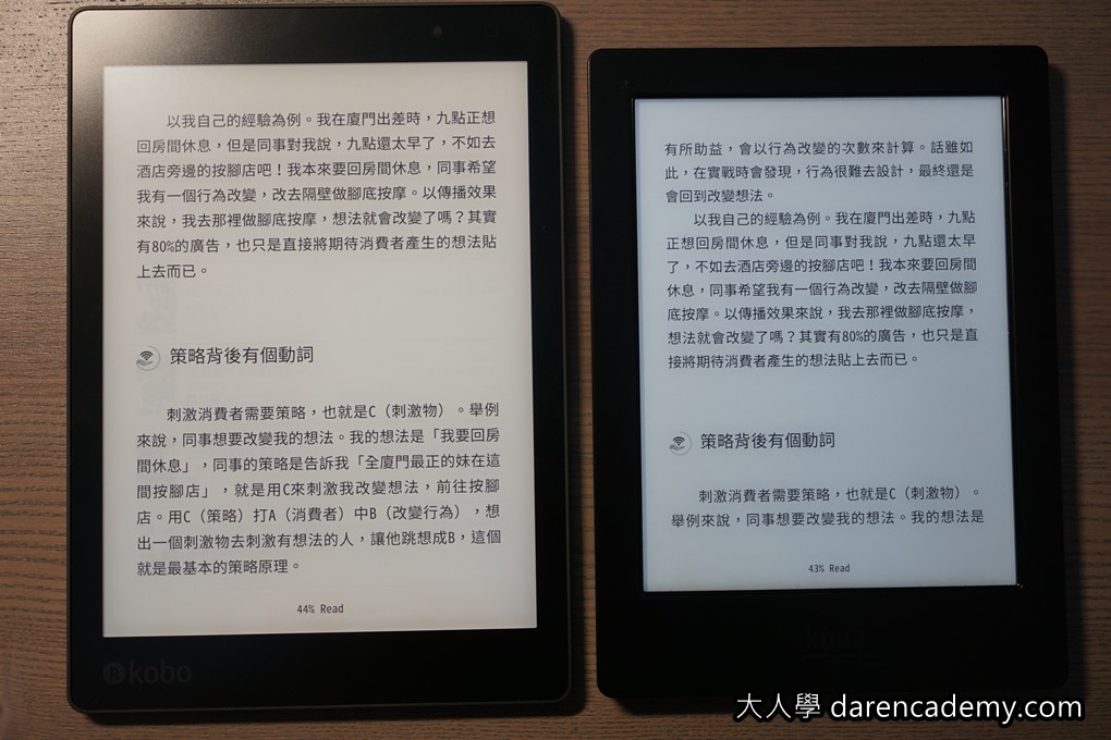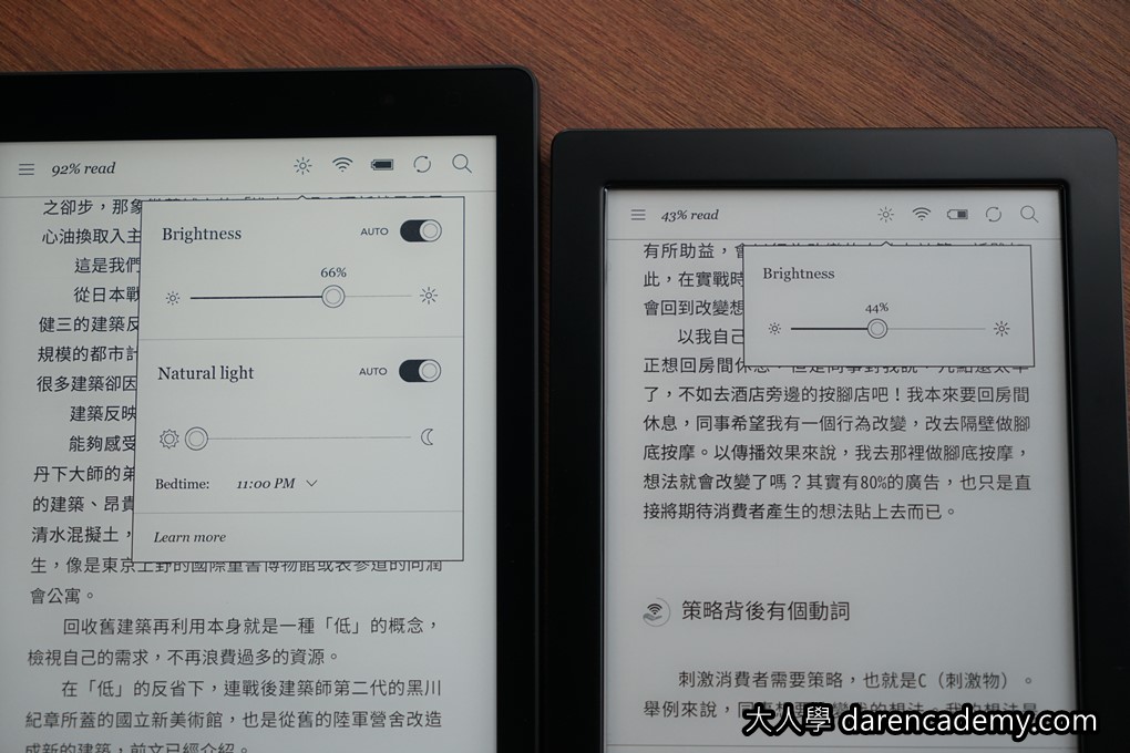 上圖左邊是夜間光線的設定打開後,右邊則是Kobo H2O的狀況,可以看到右邊是白光,左邊則比較偏紅。