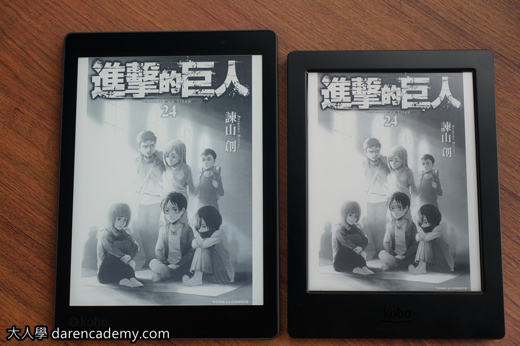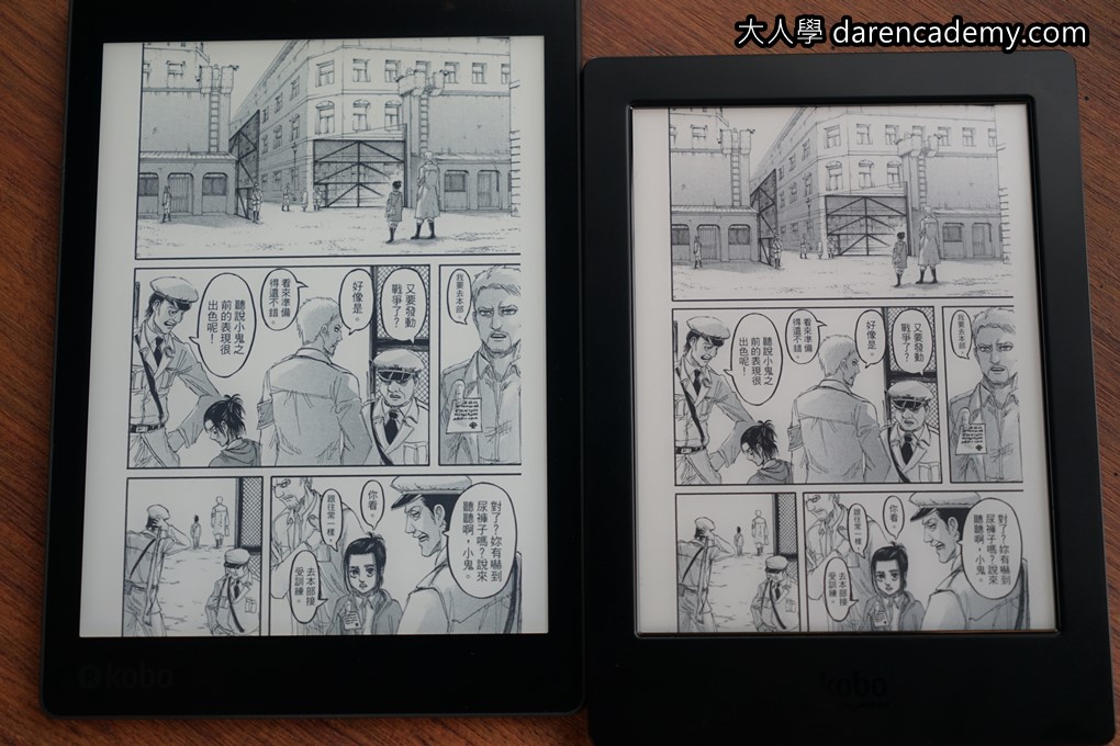 總而言之,兩台在功能上我是覺得差異不大,暖色或是能連結到Store直接購買的這兩個功能,其實也沒有這麼必須。比較有感的升級,當然還是尺寸上的升級。以漫畫而言,大一點的爽感當然就更好。從下圖你可以明顯看出來,大尺寸對於有文字量的漫畫而言,是好讀很多的。