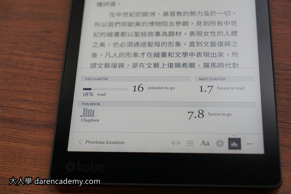 這是閱讀進度的統計,可以告訴你閱讀的百分比、這章節大概還要多久,以及每個章節的長短。