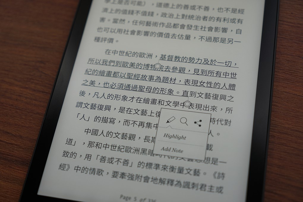 這一頁則是標註的介面,選取一段後可以選擇 Hightlight (畫線)或是 Add Note(寫筆記)。不過要注意的是,因為不支援中文介面,當然筆記也就不支援中文輸入了!(不過我本來就沒習慣閱讀時在機器上面做筆記,所以對我倒就還好)