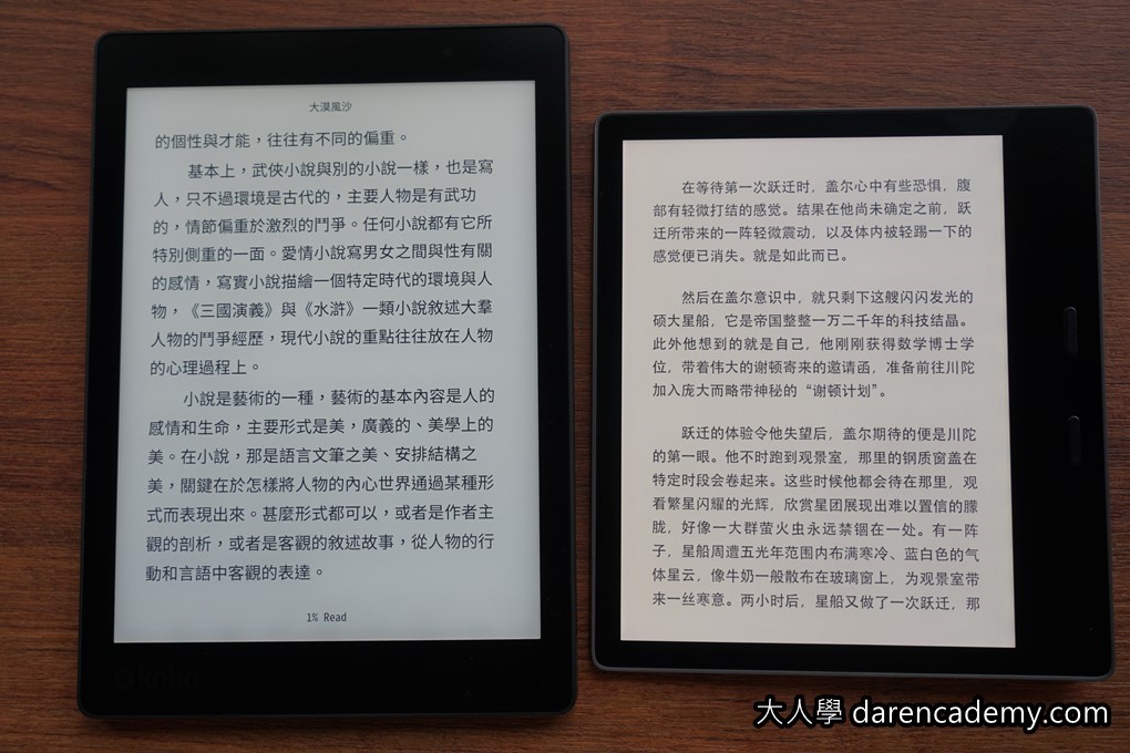 兩台的重量來比,Kindle Oasis比較輕(194g),解析度是1680*1264,而Kobo Aura One則是1872*1404。但因為Kindle Oasis是七吋,所以兩台都是300ppi。視覺上是沒有任何差異的。