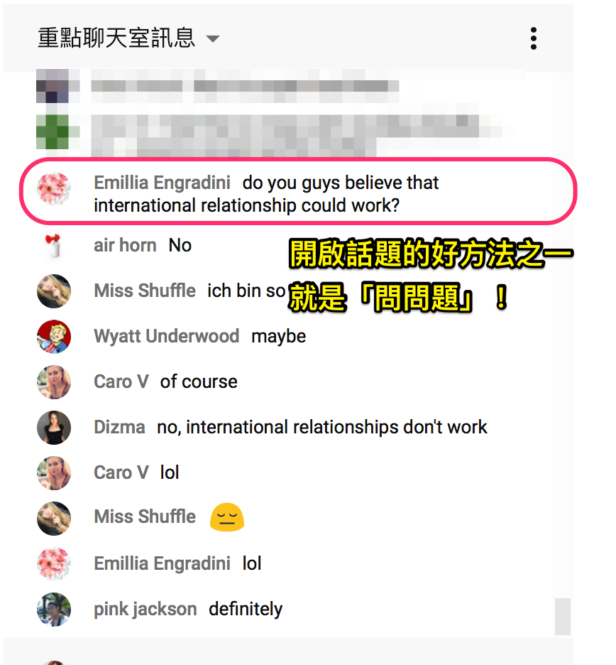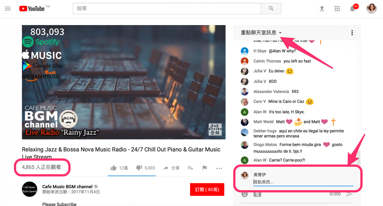 在Youtube上輸入想聽的音樂類型(只能輸入英文)後,瀏覽視窗有標示「LIVE」或「直播中」的節目,點進去後就會看到右下角有「重點聊天室訊息」,可以「寫點東西…」丟訊息給大家,若要練功就從「打招呼」開始吧(參考第1、2張照片)!