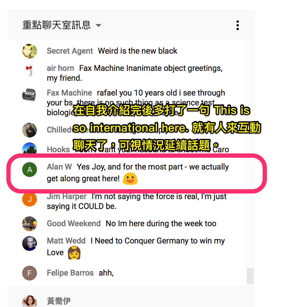 在一般社交場合中如果只介紹自己叫什麼名字,就像跟人說「你好,我是大人」一樣,容易就句點然後就GG了。想要引導別人多點互動延伸對話就要再丟些「魚餌」,例如在這樣國際場合(看看左下角有超過4000人XD),除了自己叫什麼名字之外,還可以提來自哪個「國家」 I'm fromTaiwan,外國人在分不清台灣、中國、日本等差異時就會多問幾句,又或者是針對現況「陳述事實」,例如我說 This is so international here(這裡好國際化),很快就有位叫 Alan 的人回話給我(參考第3張照片)囉。