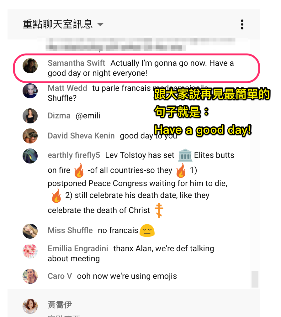 聊天到最後總是有散場的時候,最通用的句子就是 Have a good day.(像是第5張照片中的 Samantha 說的句子多打一個 night 是為了兼顧不同時區的人),還不熟悉說英文的人可以先從習慣外國人最簡單的打招呼和退場練起,看似簡單的句子,從「打」到習慣後就可以試著「說」到習慣。