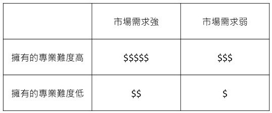 作為一個專業工作者,我們可以概略地職業市場價值歸因於兩大要素,包含:工作市場的供需關係、專業難度的高低。