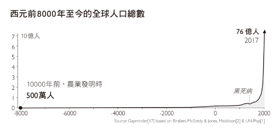 事實上,這概念在很多地方都能看到。比方說人口。環顧人類的發展歷史, 人口是花了一萬年,一直到工業革命後才突然爆發性成長。因為工業革命才終於讓生產力產生了巨大的寬餘,加上醫療的進步,這時候人口才開始指數型的成長。