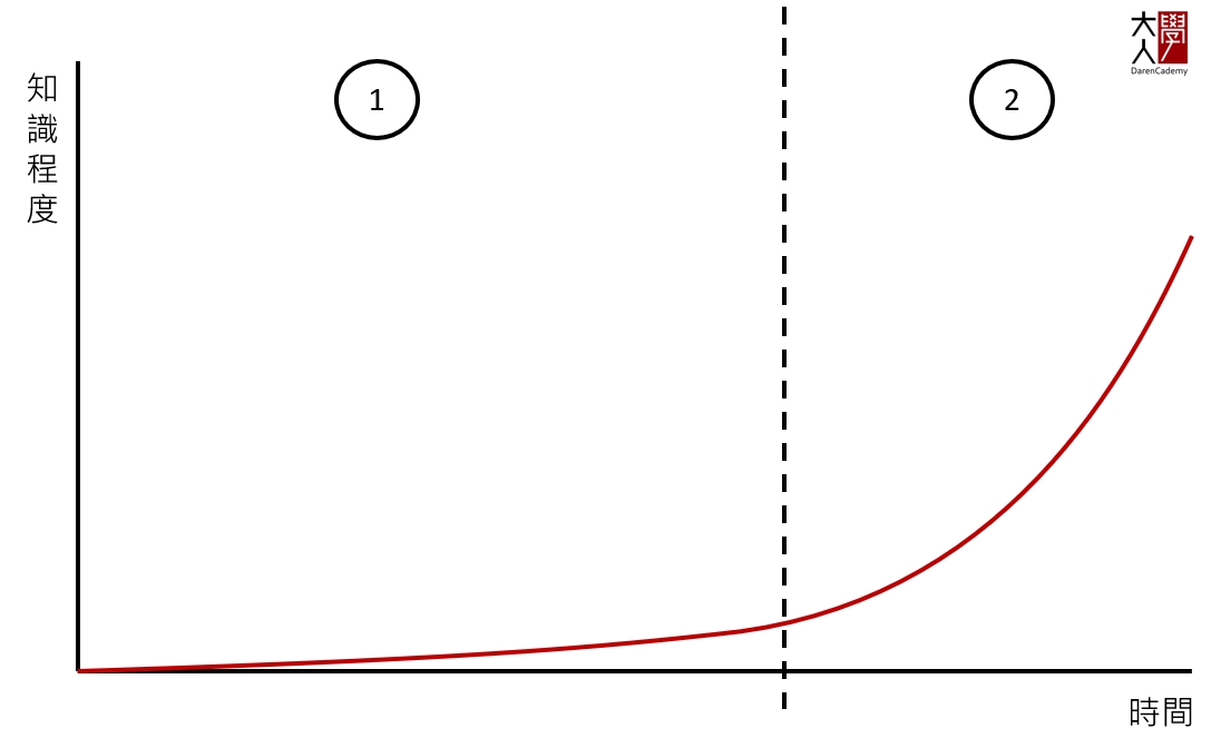 當你在無知階段,看著發散的資料、任意讀文章、上網查資料,進行碎片化的學習,你其實【不會得到任何東西】。這時候你該做的並不是發散、不能碎片、不能沒有目的,而是要思考怎麼有效的【縮減前面0-1的摸索階段】。甚至如果可以,你應該要思考有沒有辦法仰賴外力幫你把這個平緩的、分散的階段快速度地度過。