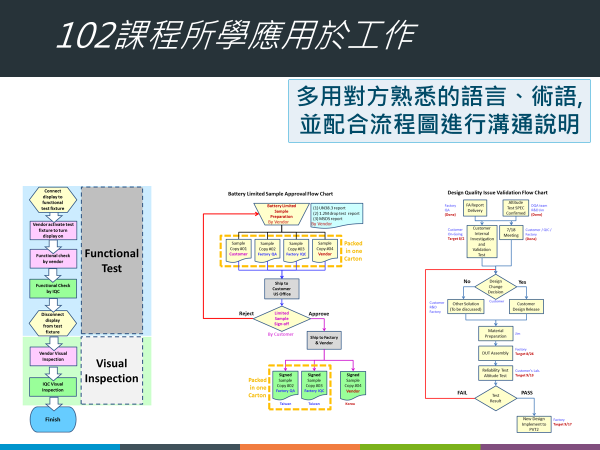 專案經理花9成的時間在溝通,卻常溝通不良。「像我們公司習慣用英文書信往返,但是下游廠商常遇到理解不足造成資訊斷層。我在102流程設計中,學會多用對方熟悉的語言、術語, 並配合流程圖進行溝通說明,蒐集各部門的限制和需求,進一步『管理期望』,進而達到雙方都能接受的目的,102流程設計與跨部門溝通這堂課裡最棒的」。