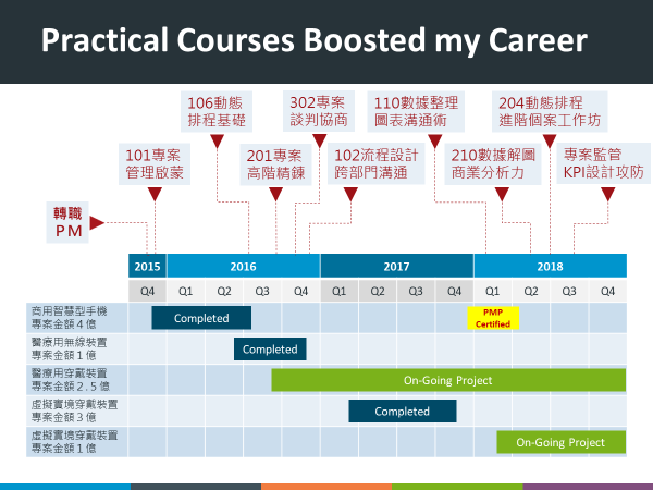 「課堂上,我漸漸了解,有些工作我早就在做,只是沒有系統化理解過,所以總是缺乏好方法。」其實有很多專案經理都是從接觸實務開始,而非一開始就是專案經理。要先接觸實務,之後再去接觸PMBOK,才會在不照本宣科之下,知道專案的核心價值在哪裡。