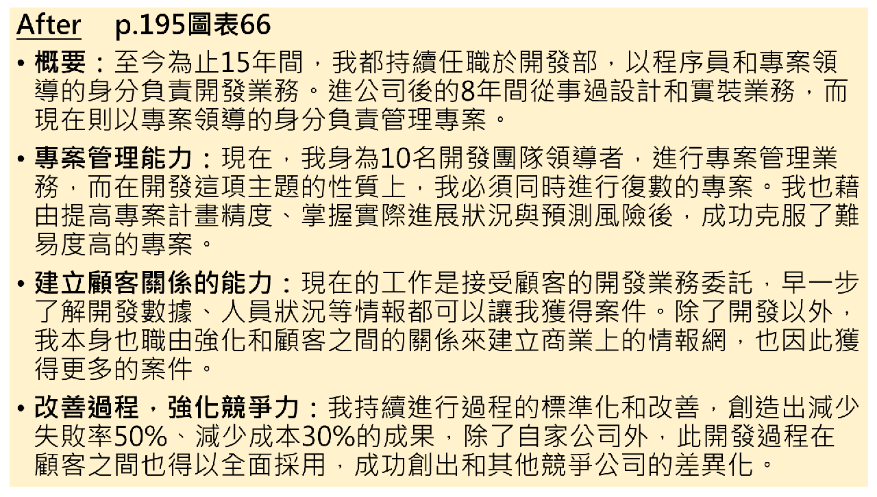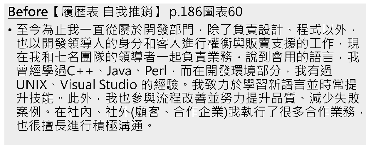 圖一改寫前版本是很常見履歷的寫法(我先前投遞不順時也是這種寫法),講好聽一點是平舖直述,但大白話就是結構紊亂,閱讀者還必須自己畫重點。一個段落裡包括「複數主題」-像是「開發領導人」、「販賣支援」、「C++、Java」、「流程改善」等,塞入太多自己希望讓雇主看見的能力(背後潛台詞是:Hello~我很棒,我什麼都會一點喔!)。就像電動的某角色技能屬性很多,乍看刀劍、黑魔法跟治癒好像什麼都會一點,但唯一的缺點是沒有辦理放大絕招,這樣的角色你會想用嗎?記住,履歷主張自己什麼都會,(雇主眼裡)等於什麼都不會。