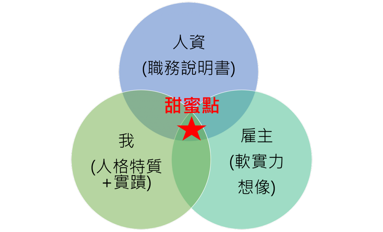 回到文章開頭強者我朋友的履歷對我的衝擊,多年前他的履歷就像是圖二After版本完美易讀。我朋友當時應聘是職缺是非主管職、強調跨部門溝通的新興科技產業,為了同時滿足職務說明書工作描述及雇主/主管對於未來夥伴的想像,經過思考便在標題置入「跨域學習」、「新創」及「橫向溝通」等關鍵字,並佐以個人特質與現職實蹟扣合,像是強調曾做過的專案屬性、跨域合作產值等履歷安排。進一步從閱讀者的角度解讀文件,單看標題就了解應聘者大致的職場定位、成就與專長(個人層次),履歷精煉過字句都是經過換位思考、職務想像(市調)才能設計出來(雇主與人資需求),以確保能一舉在圖三的優質履歷甜蜜點說服所有人。