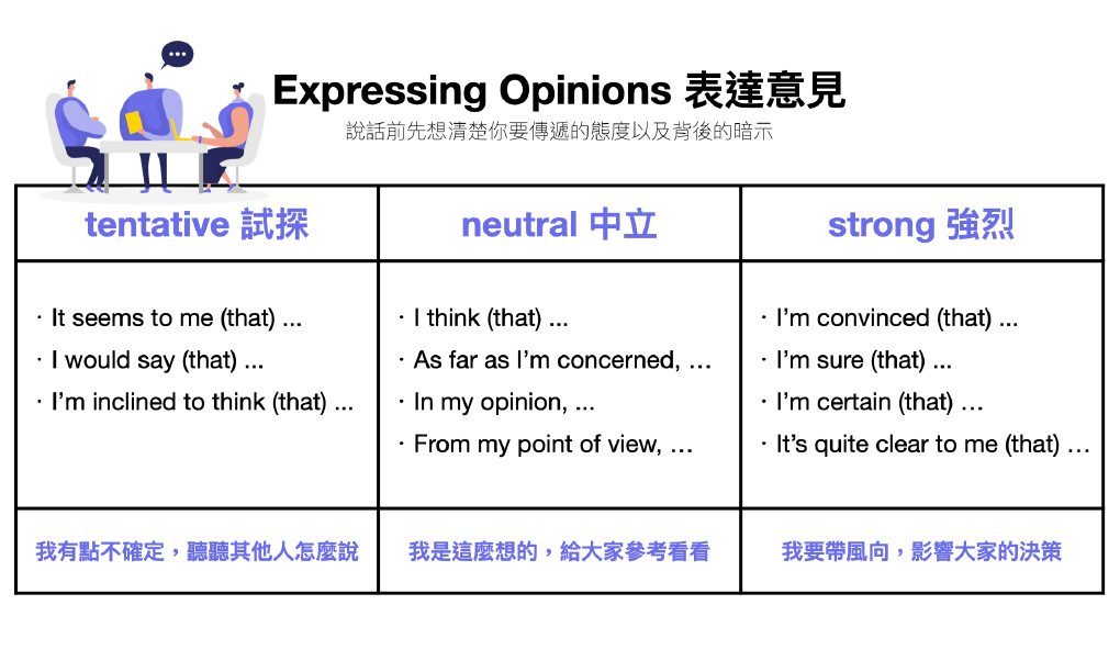 幾個禮拜前我到某個企業教「商務英文會議溝通術」,課堂上討論到如何表達自己的意見,很多同學都告訴我,在開會時如果被問到 What’s your opinion?(你的意見是?),他們就會回答 I think(我想)… 然後就把想法講完。