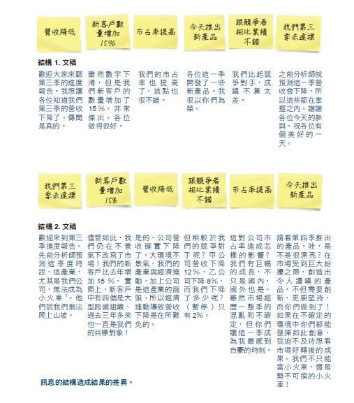 結構可以產生想要的結果。你身處何處,以及如何將某資訊與其他資訊相連,能創造意義並決定其他人接收這些資訊的方式。透過精心安排的資訊來創造情感訴求,並在簡報結束時營造出講者想要的情感效果。