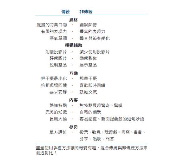 在傳統與非傳統方法間變換表達方式可以創造對比。下表為不同表達方式的對比。你可以看到運用非傳統的表達方式讓簡報更為有趣。