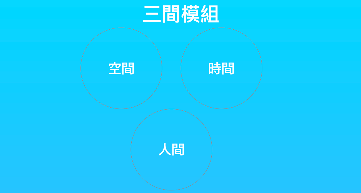 所有世俗的事情,大事、小事、瑣事,幾乎都可以用「三間模組」來拆解。空間定義了規模與影響力;時間定義了價值及方向;而人間納入了人性和人跟人的衝突與合作。