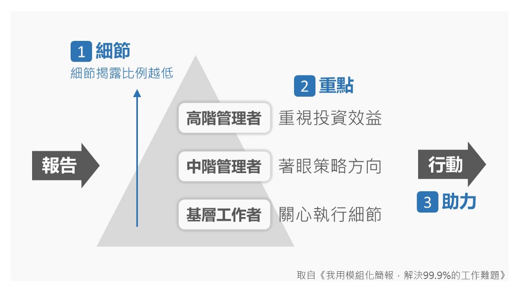 基層工作者可能在執行上需要細節說明與注意事項;中階管理者可能要向他的主管或團隊成員轉述報告內容;高階管理者可能向經營團隊、投資者或合作夥伴,簡要說明整體的策略規劃。
