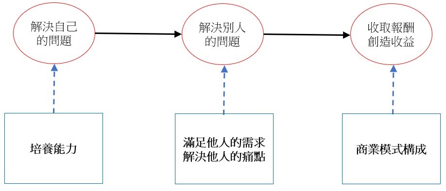 「先解決自己的問題後,你才能獲得能力;當你持續精進這部分的能力後,你才能變成專家;當你變成專家後,別人才會想要找你幫忙解決相同的問題;當你累積越多解決這方面的問題的相關經驗後,你才有辦法開始收取報酬;當你開始收費後,你的商業模式才算具體運作,你的斜槓也才得以建構發展。」
