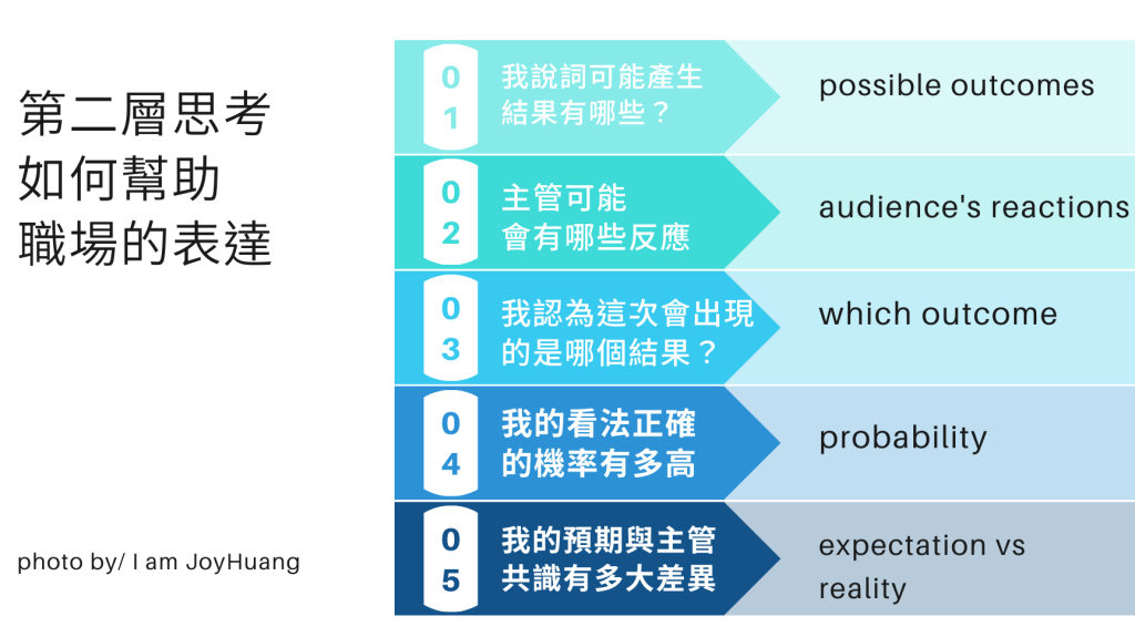 那麼,在職場上的表達中,第二層思考要怎樣才提升別人聆聽意願?在企業內訓和公開課程「上班族的商務簡報術」的安排中,喬伊針對不同主題會提供更多系統化的思考,以及具體的應變做法。不論是希望上班族表達更有邏輯、簡報更簡潔有力等。