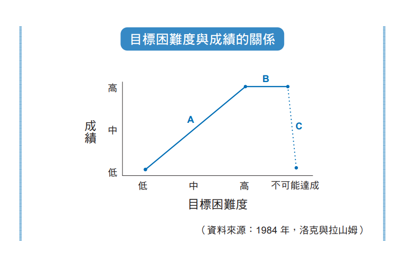 洛克等人根據許多研究的結果,針對目標困難度與成績的關係,提出下圖所示的模式。圖中斜線 A 表示目標越高,越能提升成績,但到了一定程度後,再怎麼努力也無法提升成果,到達能力的極限,也就是圖中 B 的位置,只要仍努力接近目標,成績就不會低落。