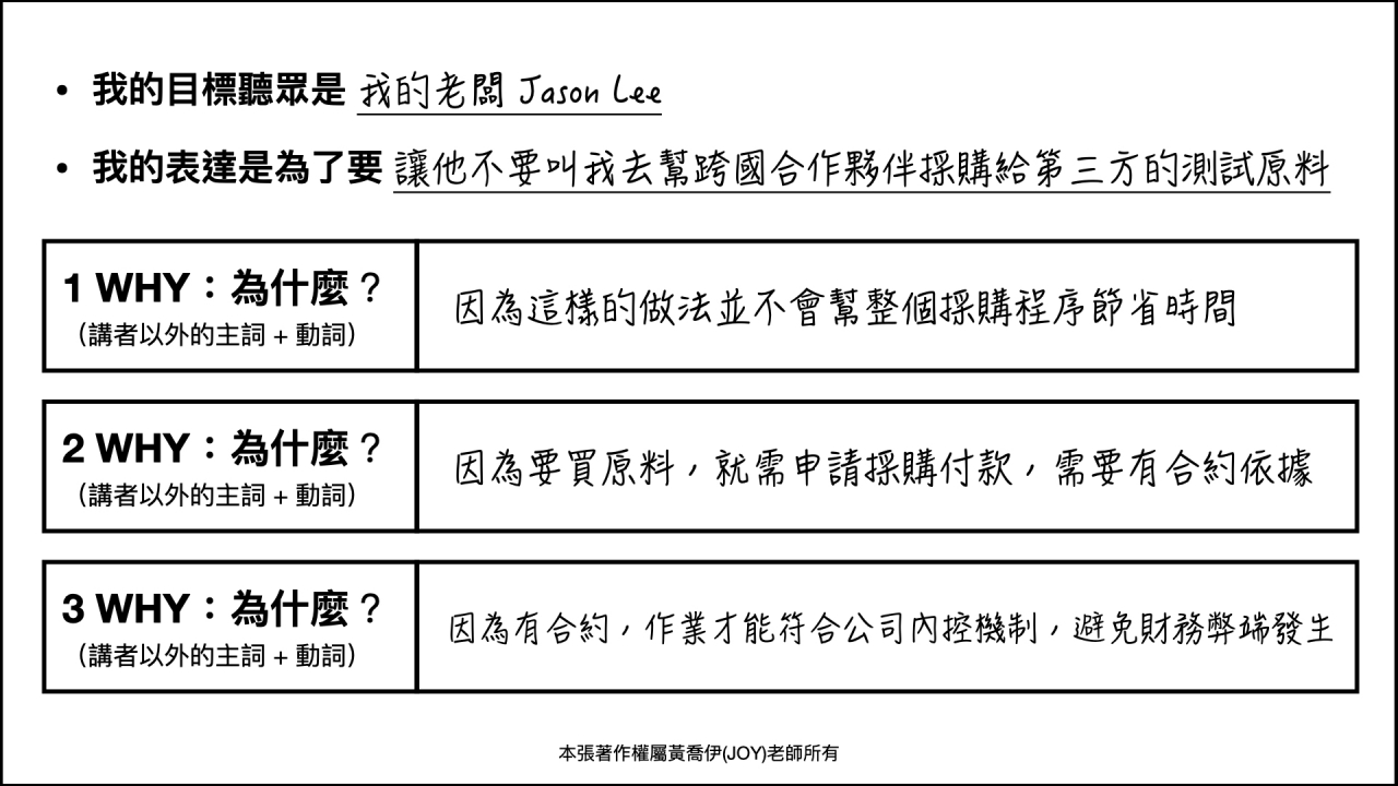 「3WHY」就是「在你要說話表達想法前,先問自己三次為什麼」。例如之前有同學和主管起爭執,因為他不想讓公司去幫合作單位購買測試原料,但在表達的過程,卻無法清楚客觀的說明「why」,主管聽完只是一頭霧水,覺得幫忙購買只是舉手之勞,為何不幫忙?