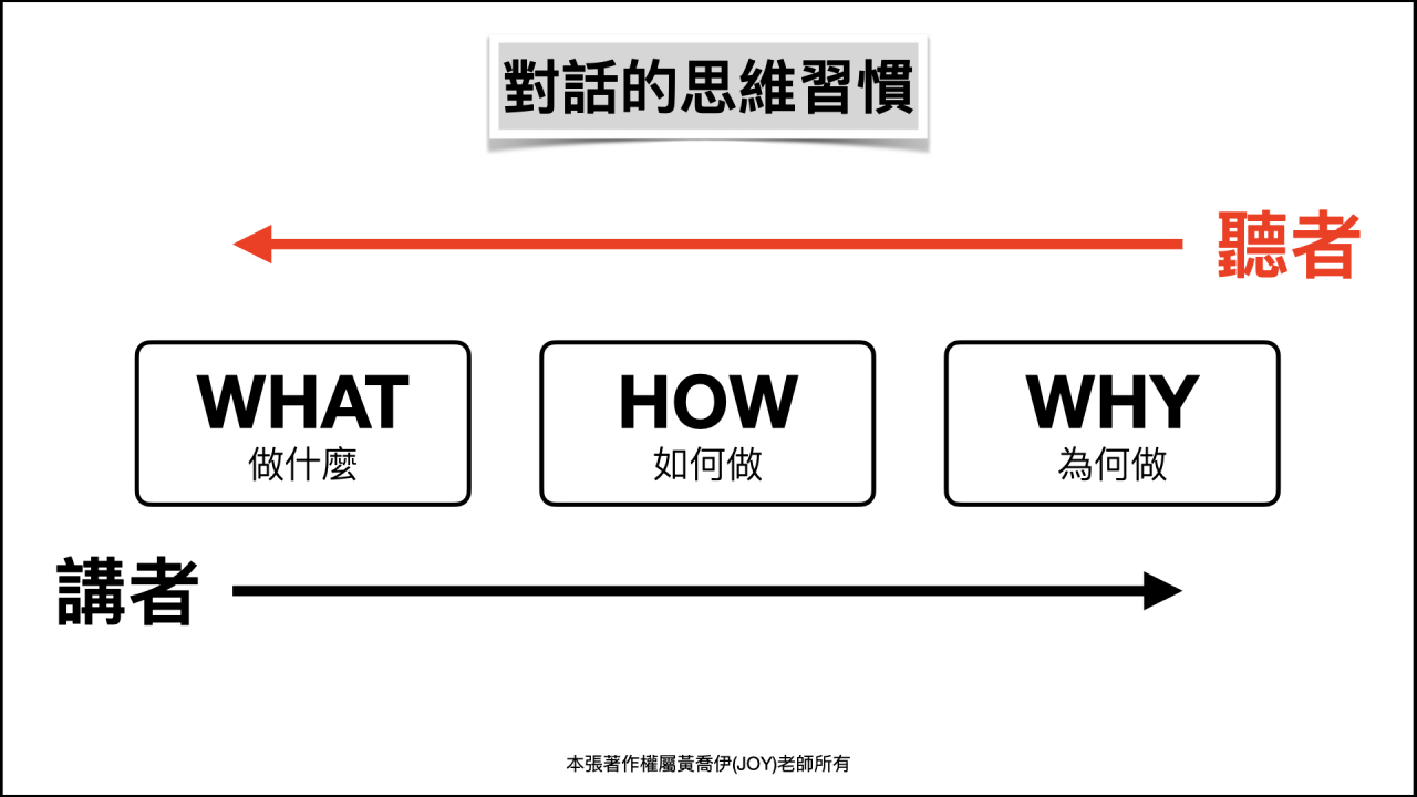 先說結論。對話中,雙方的思維模式並不相同:主動開啟對話的人(講者),通常傾向用 what 思維在說話,而被動聽人說話的另一方(聽者),則習慣用 why 思維來回應。請看下圖。