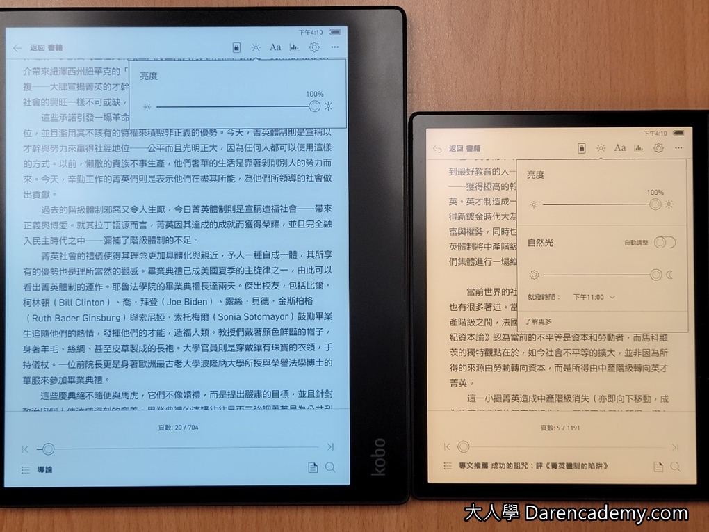 再來,Elipsa跟Forma在功能上最大的差異,在於亮度調整沒有夜間黃光模式了。下面右圖可以看到Forma開啟黃光的狀況,但左邊的Elipsa再也沒有可以調整之處了。
