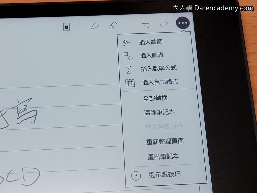 筆記的呈現則如下,可以做純筆記、可以插入數學公式、可以繪圖、也可以幫你把手寫轉成文字儲存。