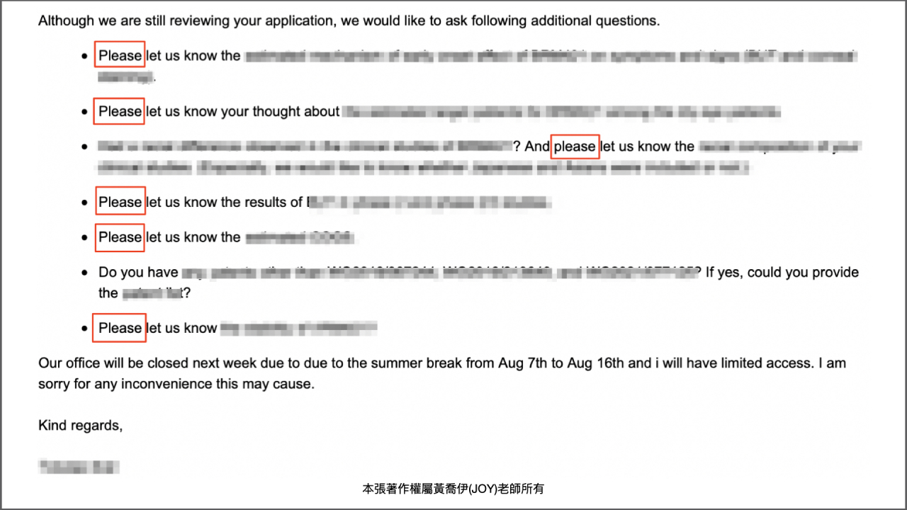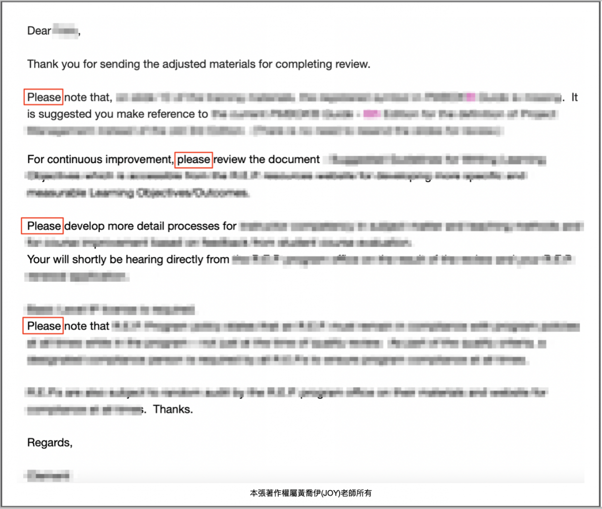 今天這篇喬伊就先來講講「請(please)」的語氣,以及解套的寫法。來看兩個用馬賽克處理過的實例: