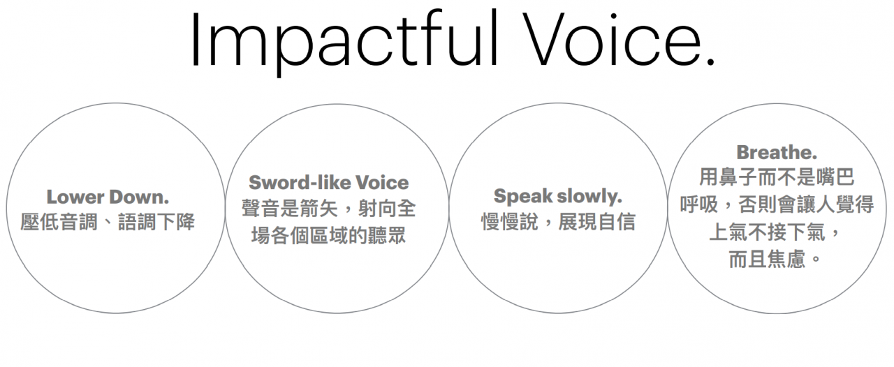 Olivia Cabane 寫作的《魅⼒學:無往不利的⾃我經營術》(是我非常喜歡的一本書,當中提到 4 項具有影像⼒的聲⾳展現技術分別為: