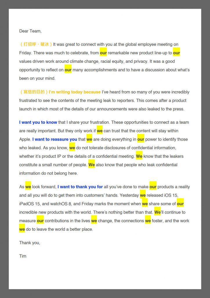 除了第一段的破冰和第二段描述寫信目的之外,在第三段和第四段的內容裡,庫克用了多次 We 開頭的句子(黃底黑色粗體字),強調「和同仁站同一陣線」,展露出「我們是一體的」士氣!