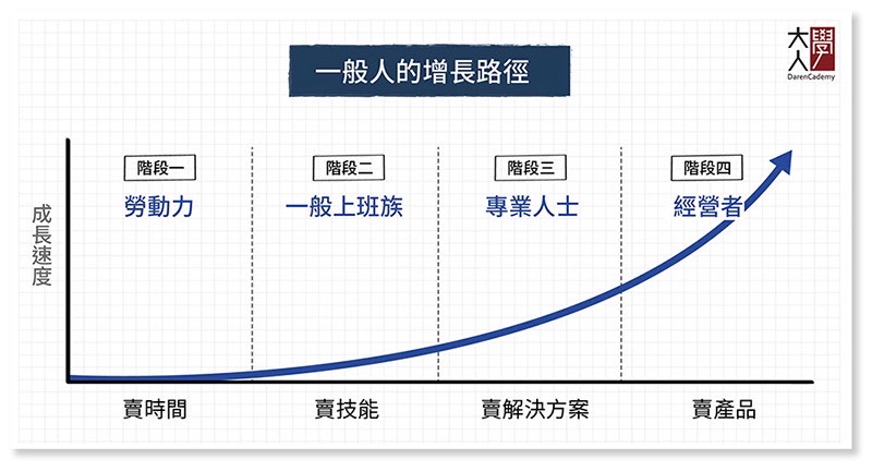 其實,就是我在【用經營公司的思維經營你的人生】提過的人生四階段(如下圖)。這四個階段的認知是跳脫產業、跳脫職能的。你如果扎實地搞懂自己在哪個階段、這個階段的需求與挑戰,接著再採取行動,讓自己逐步往後面階段跨,那麼日子自然就能逐漸走得穩當!