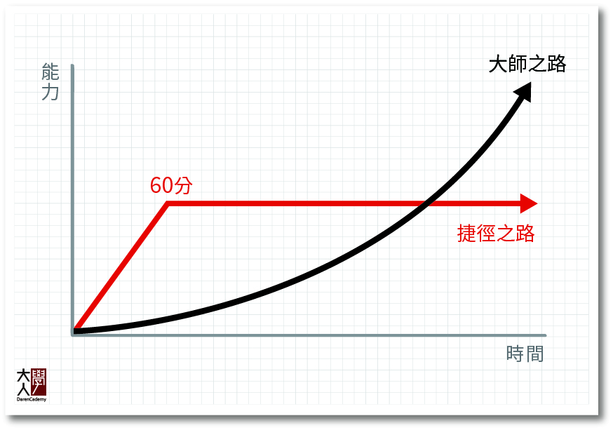 以下面這張圖來看,紅色這條線是捷徑之路,我們走上了,會很快升級到 60 分,但後面無論再怎麼努力,都會發現自己始終進步緩慢。相反地,黑色這條則是踏實的路,我們一開始會感覺進步緩慢,但若好好努力、踏實地前進,最後卻有可能突破 60 分限制而成為大師!!