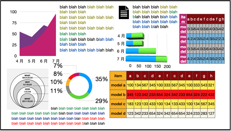 很多人對投影片上的圖表、文字、照片等資訊要「擺哪裡」,幾乎是看到哪裡有空白就塞哪,東西散落地沒一個秩序(參考下圖)。