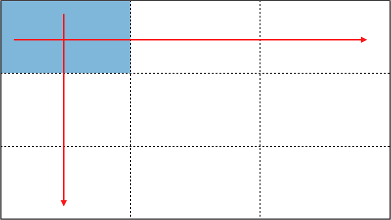 一份簡報不管有幾頁,每頁投影片都可以像上圖的概念一樣,分為九宮格。接下來要注意的是,投影片畢竟是做給聽眾看的,所以在製作時要以「聽眾視角」呈現。由於人的閱讀路線習慣「由上而下、由左而右」(兩條紅色箭頭處),因此,兩條紅線的交界處(左上角的淺藍色塊)就是投影片最貴的地段,當然要放最能提升簡報價值的內容,例如看一眼就能知道投影片在講什麼的「標題」,又或者整件事的「結論」。