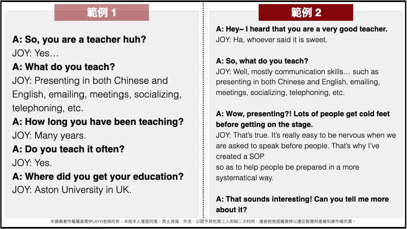例如同樣是上圖,之所以要把範例 1 放左邊,是因為我想先帶出多數人在聊天時的通病,因為多數人以為和別人聊天,總得想一堆題目才能延續話題,結果卻適得其反搞得像 FBI 審問犯人似的,讓人覺得不舒服;講完通病後,那麼大家可能就會好奇那該怎麼辦呢?於是再接著用右邊的範例 2 ,說明聊天其實是有方法的。藉由左右範例的比較,讓讀者可以看出其中的差異,才能在日後多注意不要犯了左邊的錯,而要多加利用右邊的技巧。
