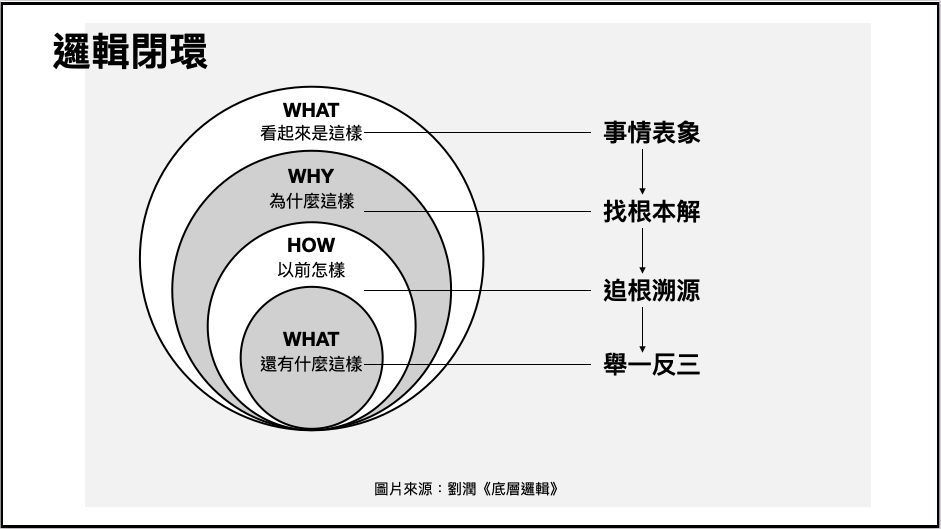 「接下來我要講的是『邏輯閉環』,就如各位看到的,左邊 4 個同心圓分別代表思考的層面,右邊則是每個層面代表的意義為何。為了有效解決問題,可以用此圖的「3W1H」校準問題根源,才不會找錯問題方向而淪為白忙一場。」