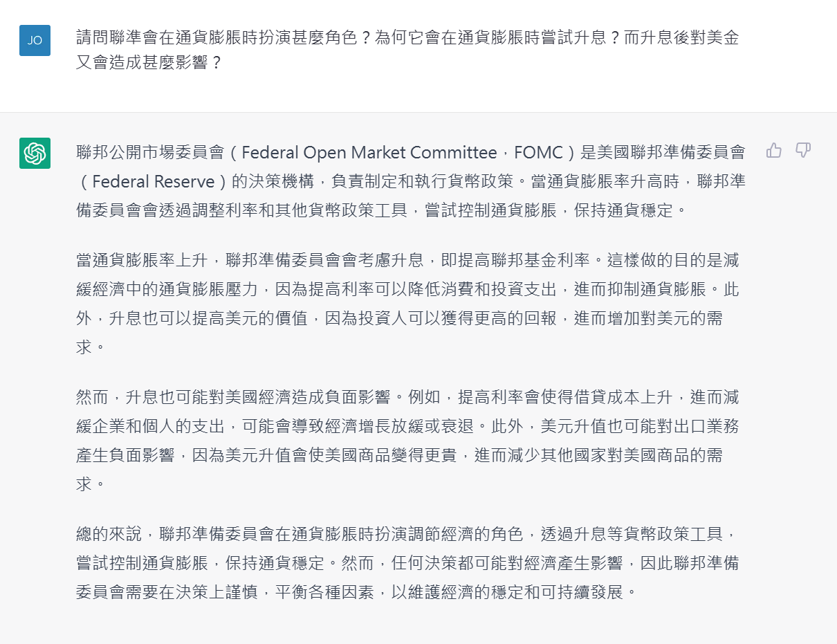 也可以這樣問:「請問聯準會在通貨膨脹時扮演甚麼角色?為何它會在通貨膨脹時嘗試升息?而升息後對美金又會造成甚麼影響?」