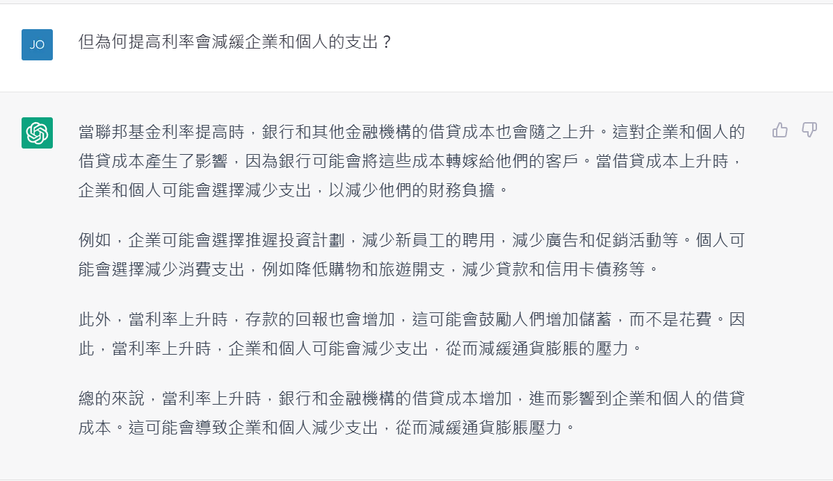 它會記得你們對話的脈絡。你把它當成人來提問,效果其實相對會較好的。像剛剛它說升息會減緩企業與個人支出,你如果不理解這脈絡,你就可以繼續提問如下:「但為何提高利率會減緩企業和個人的支出?」,它也會延續回答。。