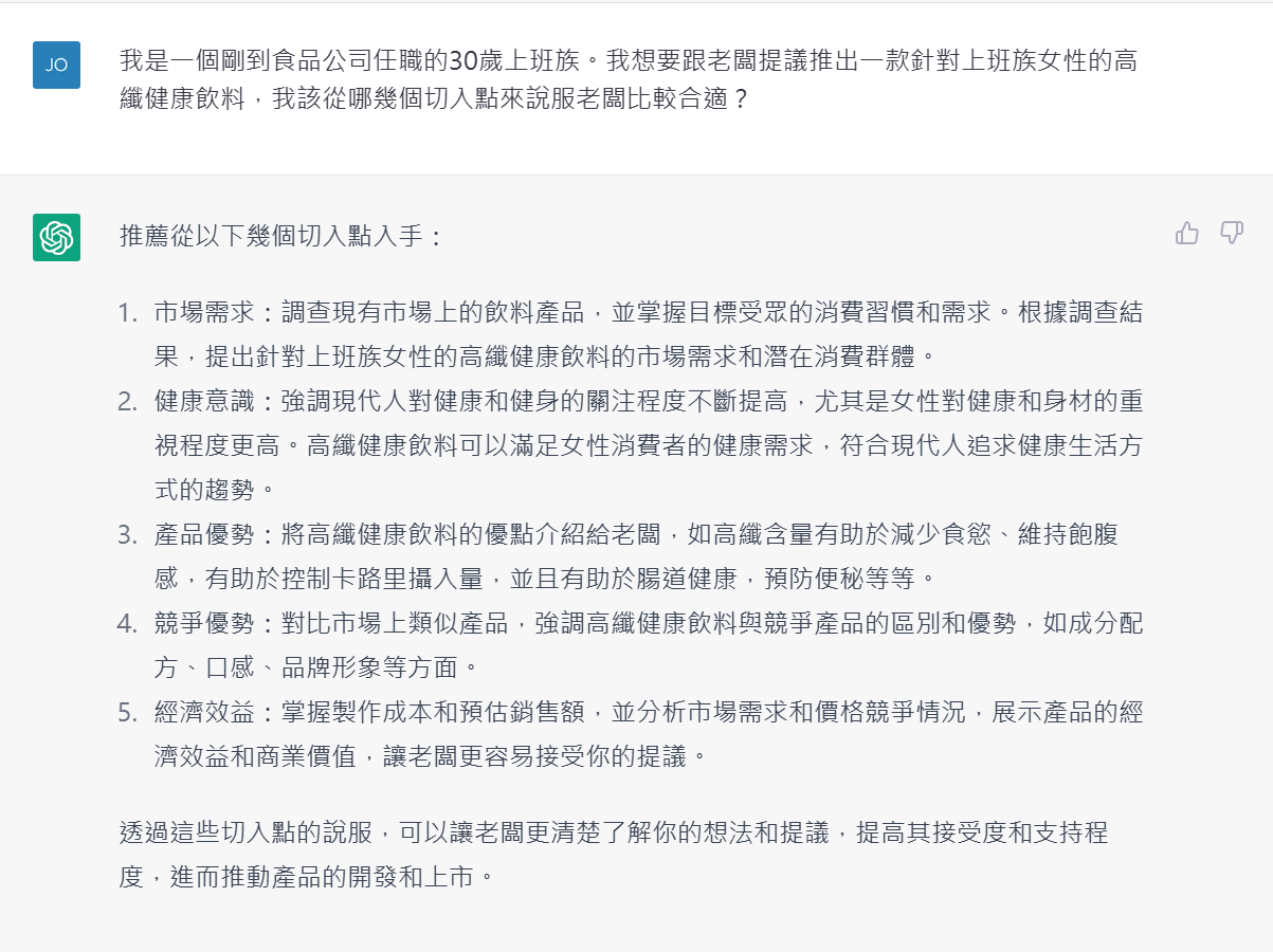 你如果只問:「我該怎麼跟老闆提案?」那它可能會給出很差的回饋,因為這問題沒頭沒尾也沒脈絡。但你若寫說:「我是一個剛到食品公司任職的 30 歲上班族。我想要跟老闆提議推出一款針對上班族女性的高纖健康飲料,我該從哪幾個切入點來說服老闆比較合適?」它會給你如下的明確建議。
