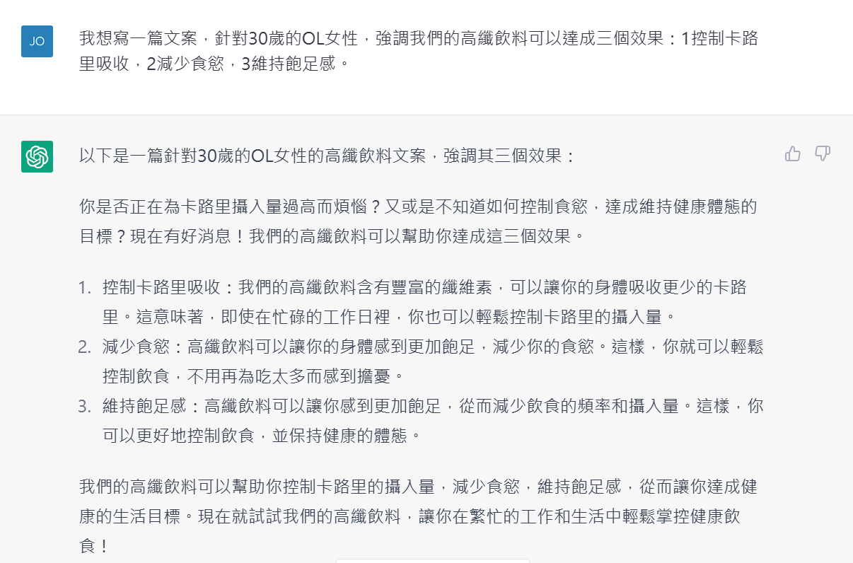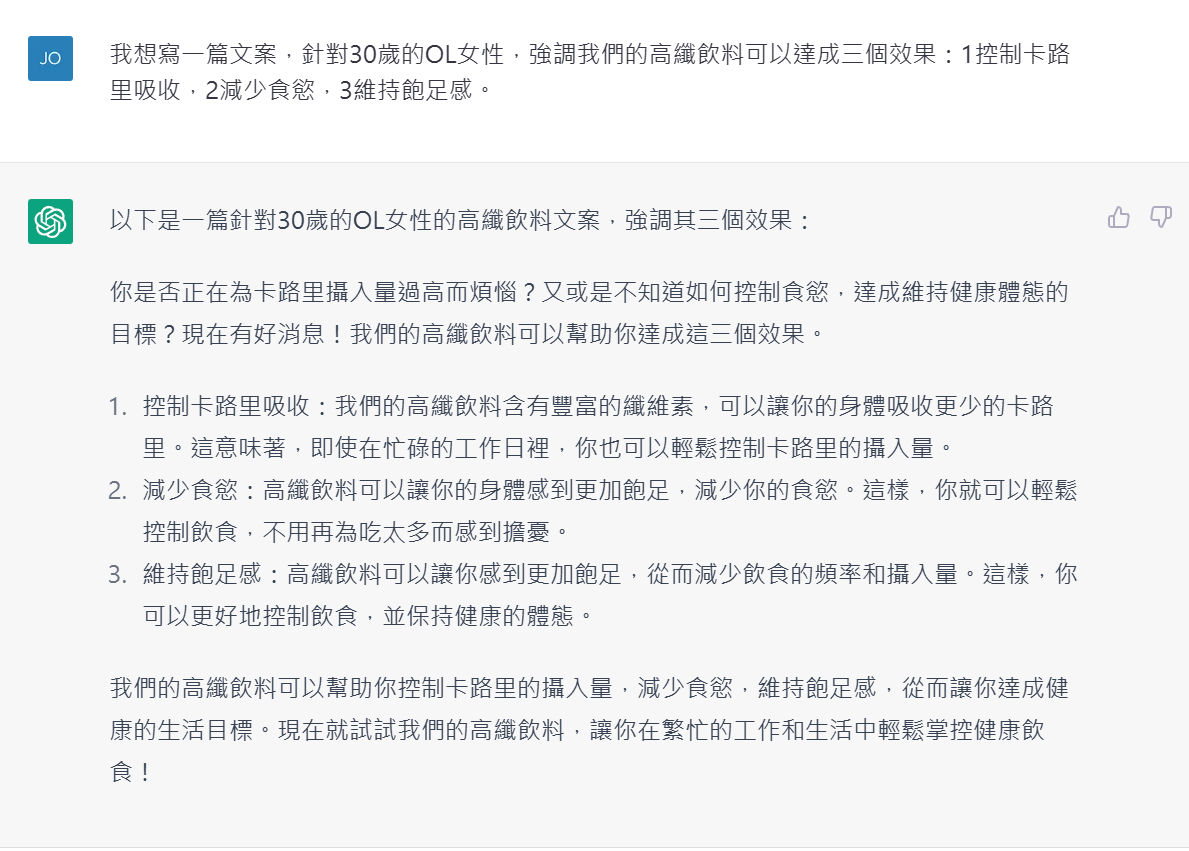 你可以使用這樣的句型:「我想寫一篇文案,針對 30 歲的 OL 女性,強調我們的高纖飲料可以達成三個效果:1. 控制卡路里吸收,2. 減少食慾,3. 維持飽足感。」