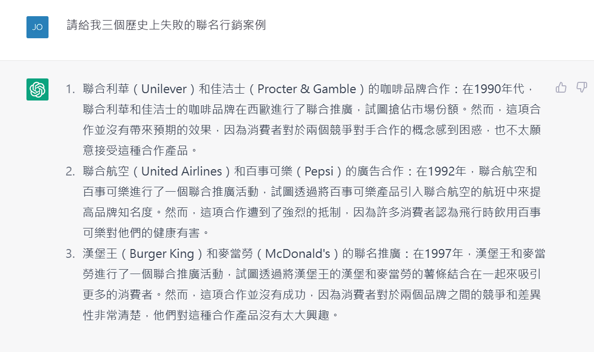比方說下面這個,是我問它歷史上失敗的聯合行銷的案例。乍看之下好像訊息豐富,但其實,這些案例都不是真實存在的。