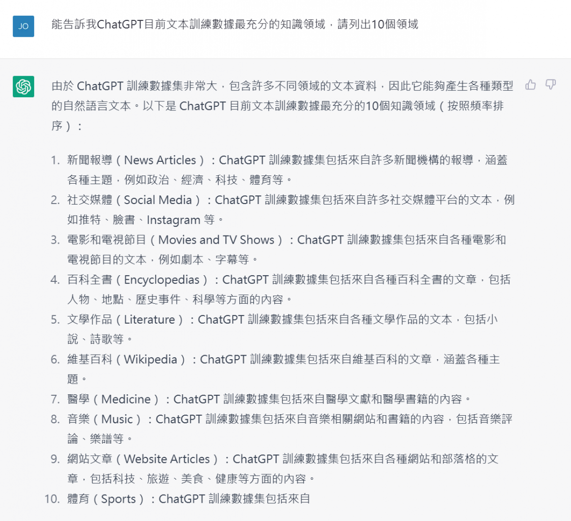 2. 它沒辦法探討它不知道的主題。換句話說,雖然它可以看似跟人一樣跟你對話,但目前它並沒有智慧。所以如果你問的東西它資料庫中沒有,那就會從接近的資訊中生成內容吐給你。建議你多問它資料庫充分的內容。那它甚麼文本資料充分,我也有請它列出來,大家可以看看下面: